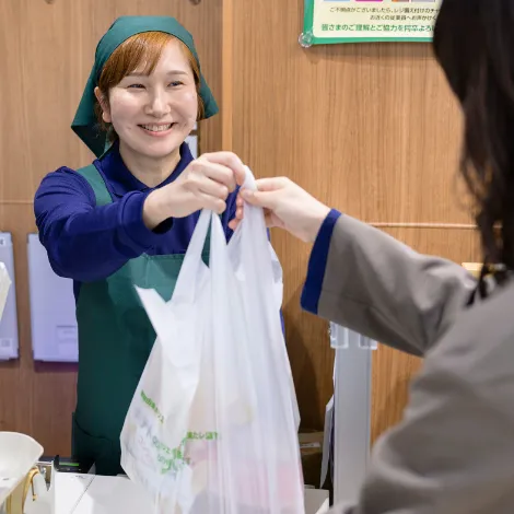 日本の大学で学んでいる留学生です。まいばすけっとでは週4日、授業が始まる前の時間で働いています。1日2時間半くらいです。まいばすけっとは、日本語学校の友達に教えてもらいました。その友達もまいばすけっとで働いているのですが。「仕事もやさしいし、一緒に働く人もいい人ばかり。」そう勧めてくれたのです。私もお客さまとして、まいばすけっとに行ってみて、働く人の笑顔、雰囲気のよさを感じて、ここで働こうと決めました。お仕事を始めてもう1年半がたちました。とても楽しく、笑顔で働くことができています。